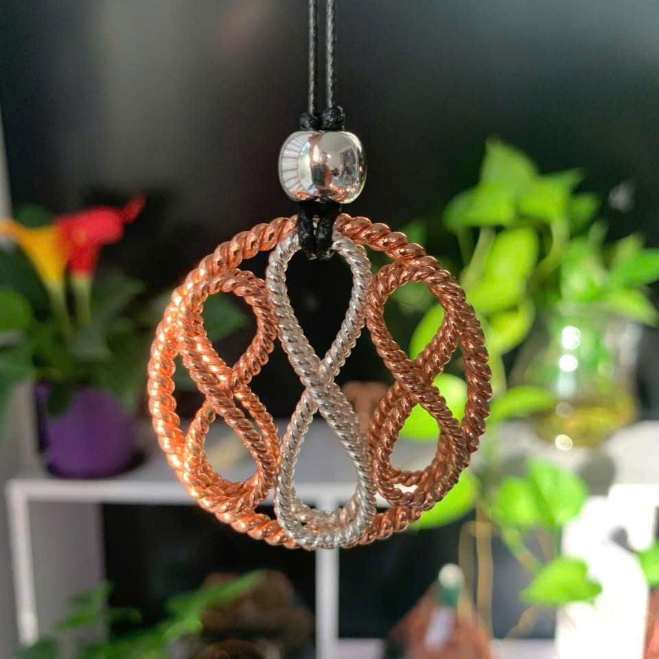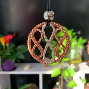 This handcrafted pendant, featuring the timeless infinity symbol, is meticulously crafted from twisted pure copper and silver wires. Its double-sided design emits three powerful healing frequencies—144 MHz, 177 MHz, and 188 MHz—supporting spiritual connection, emotional balance, and physical well-being. A perfect blend of beauty and energetic purpose, this pendant is ideal for daily wear or meditation.