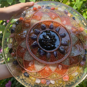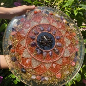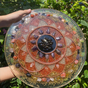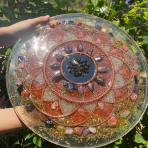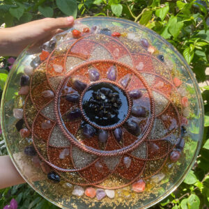 This large Orgonite disc (36cm in diameter) is an exquisitely handcrafted energy device using the Orgonite technique, incorporating the Tensor flower of life with three frequencies of 177 MHz, 432 MHz and 144 MHz in 99.99% pure red copper. The upper layer is harmoniously arranged with natural crystals of white, purple, rose, Shungtie quartz… Designed according to the principle of sacred geometry, the disc acts as a powerful energy converter, cleansing the living space and neutralizing EMF.