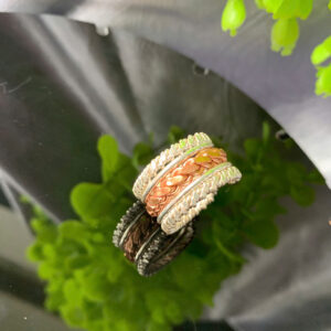 This ring is made from a 4-twist Tensor Ring in pure 999 silver and is accented with a 4-twist red copper border in the middle, creating a standout highlight of the product.